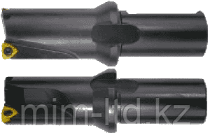 Сверла с механическим крепление сменных многогранных неперетачиваемых твердосплавных пластин. Сверла с МНП, в том числе, однослойным или многослойным износостойким покрытием предназначены для сверления отверстий на станках с ЧПУ, автоматических линиях и агрегатных станках, удовлетворяющих установленным для них нормам точности и жесткости, с помощью привода 7-30 кВт. Радиальная система жесткости "СПИД" должна быть не менее 8000-15000 Н/мм2 а зависимости от диаметра сверла. Сверла выпускаются с цилиндрическими и коническими хвостовиками, могут иметь внутренний подвод СОЖ и оснащены двумя пластинами, фиксируемыми винтами. При установке сверел на станке с применением специальных переходных патронов и устройств для подвода СОЖ возможны следующие конструктивные варианты: